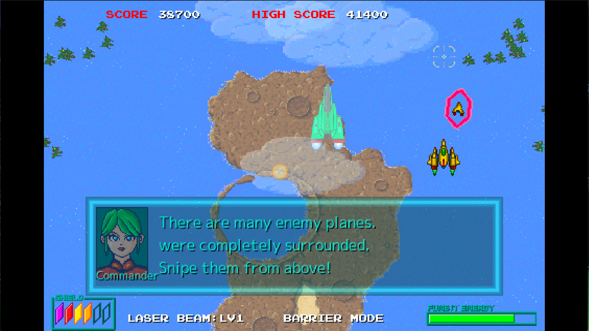 Overview of this work A retro arcade-style, 2D vertical scrolling shooterPixel art inspired by 16-bit consoles and arcade games from the '80s and '90sOriginal shooter Focus on the exhilarating "aim, shoot, kill" feel of the original shooter game.Receive communications from Controller Luna as you progress through each stage's story(6 stages in total). Includes exciting new features like atmospheric re-entry and escorting allied aircraft.Enjoy a shooter game that deliberately avoids rapid fire and excessive bullet barrages! Features ✅Switch between a variety of weapons and barriers, including targeting lock-on missiles, laser beams, 3-way shots, and power shots, to strategically progress through the game! ✅Understand the story of each stage through conversations with controller Luna and others! ✅Interesting events such as atmospheric re-entry and escorting allied aircraft are available! ✅Play over and over again to challenge yourself to the highest enemy aircraft shoot-down rate and unlock hidden characters! |